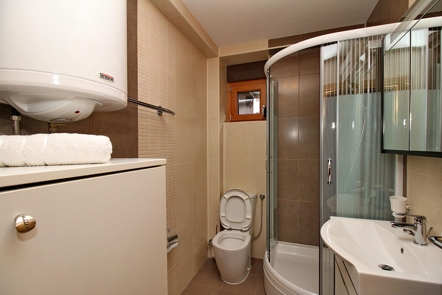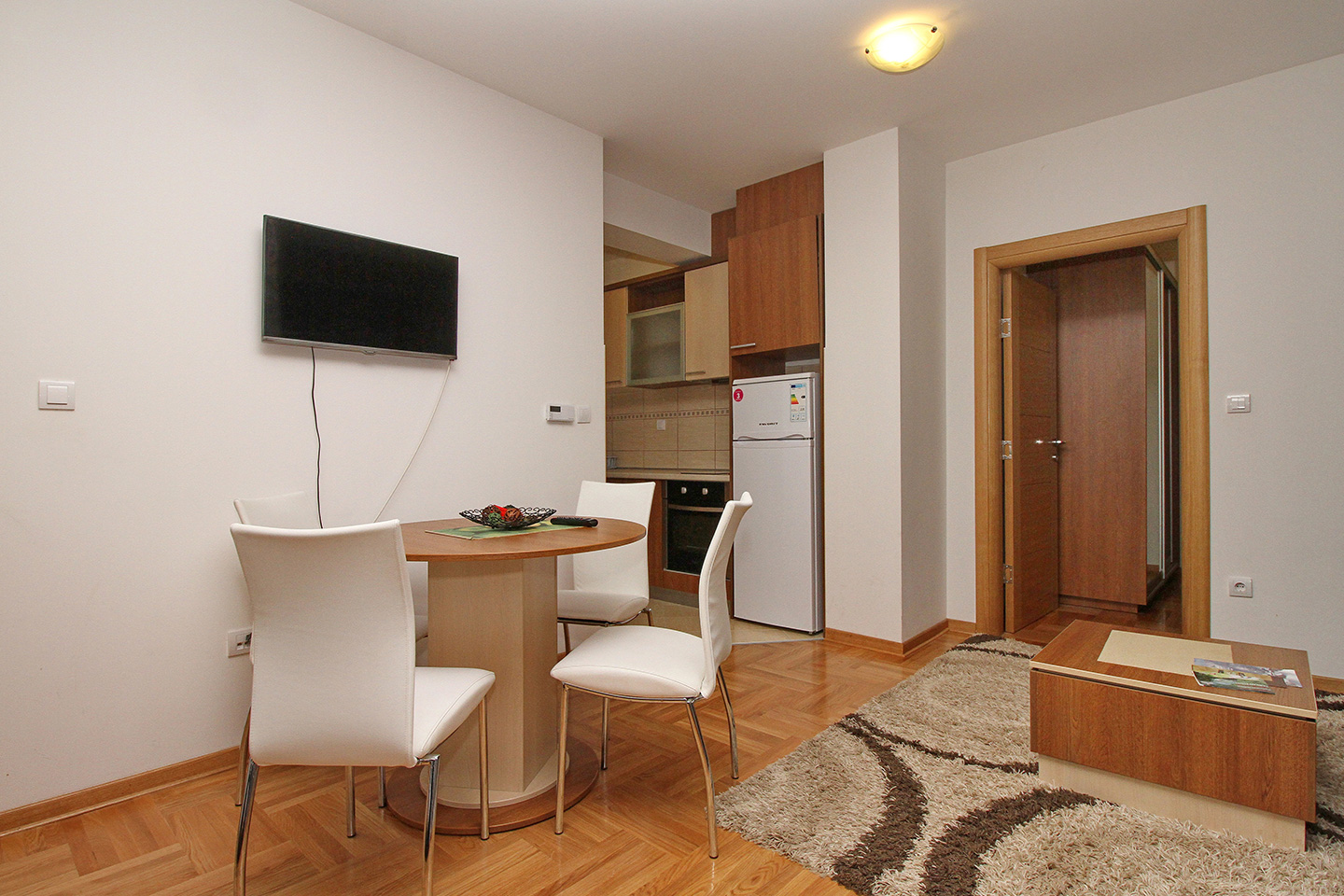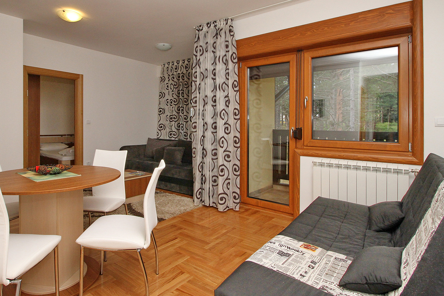 Opis Luksuzno opremljena kuhinja, spavaća soba sa francuskim ležajem, kupatilo i terasa sa pogledom na borove šume, dnevni boravak, kapacitet apartmana 5 osoba.