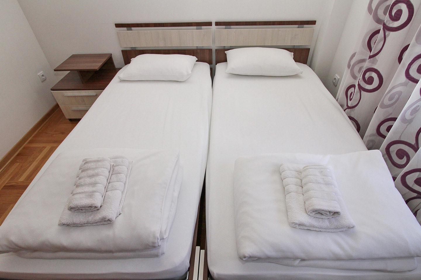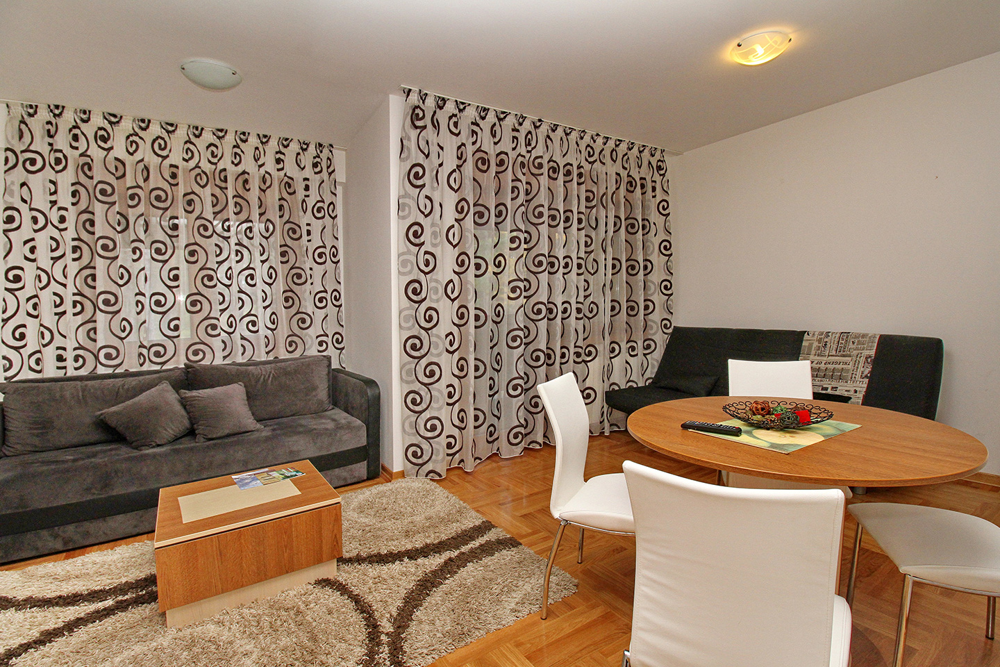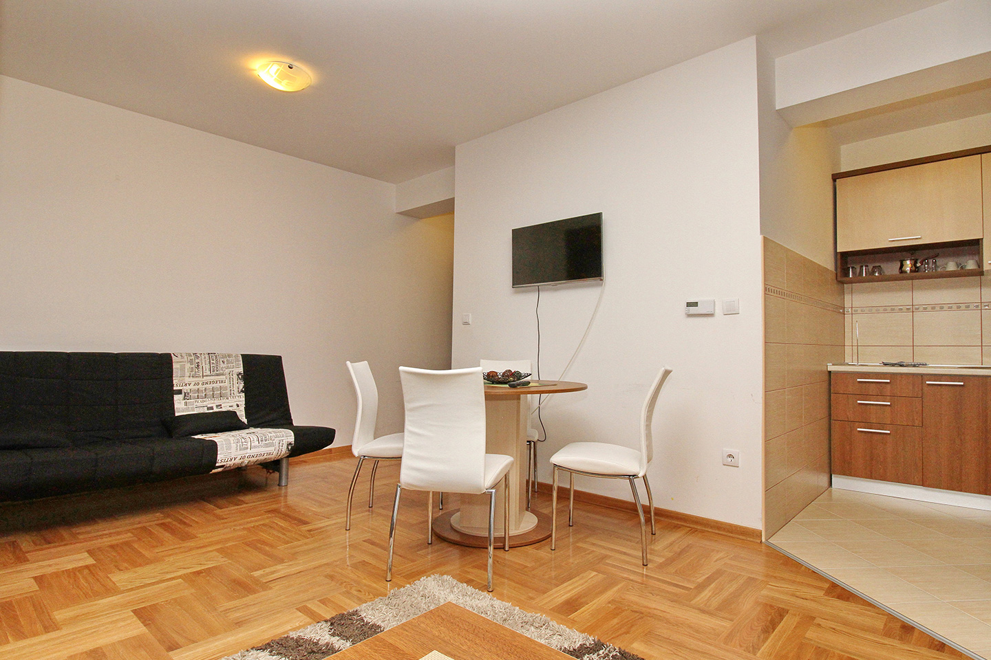 Opis Luksuzno opremljena kuhinja, spavaća soba sa francuskim ležajem, kupatilo i terasa sa pogledom na borove šume, dnevni boravak, kapacitet apartmana 5 osoba.