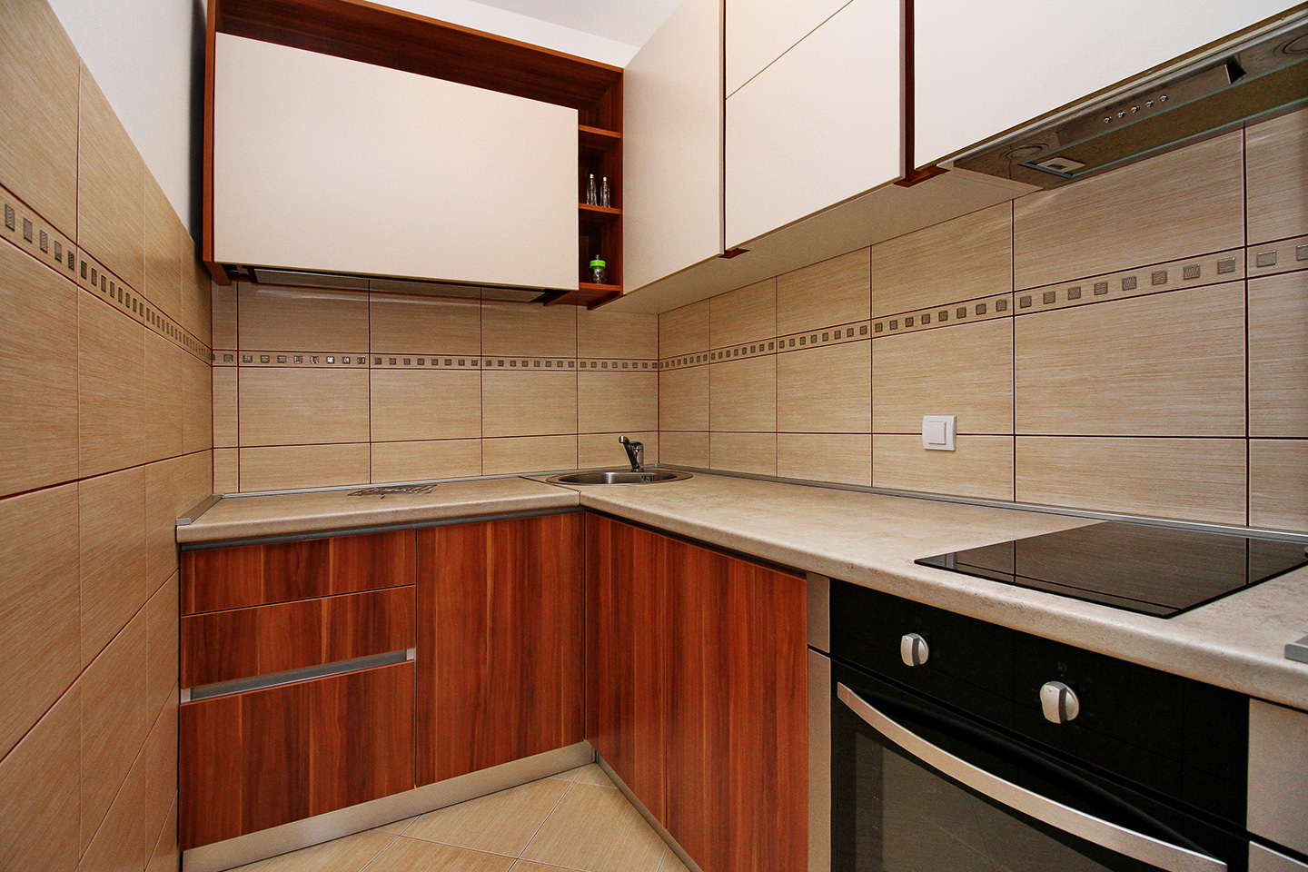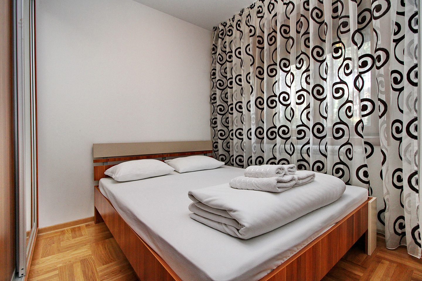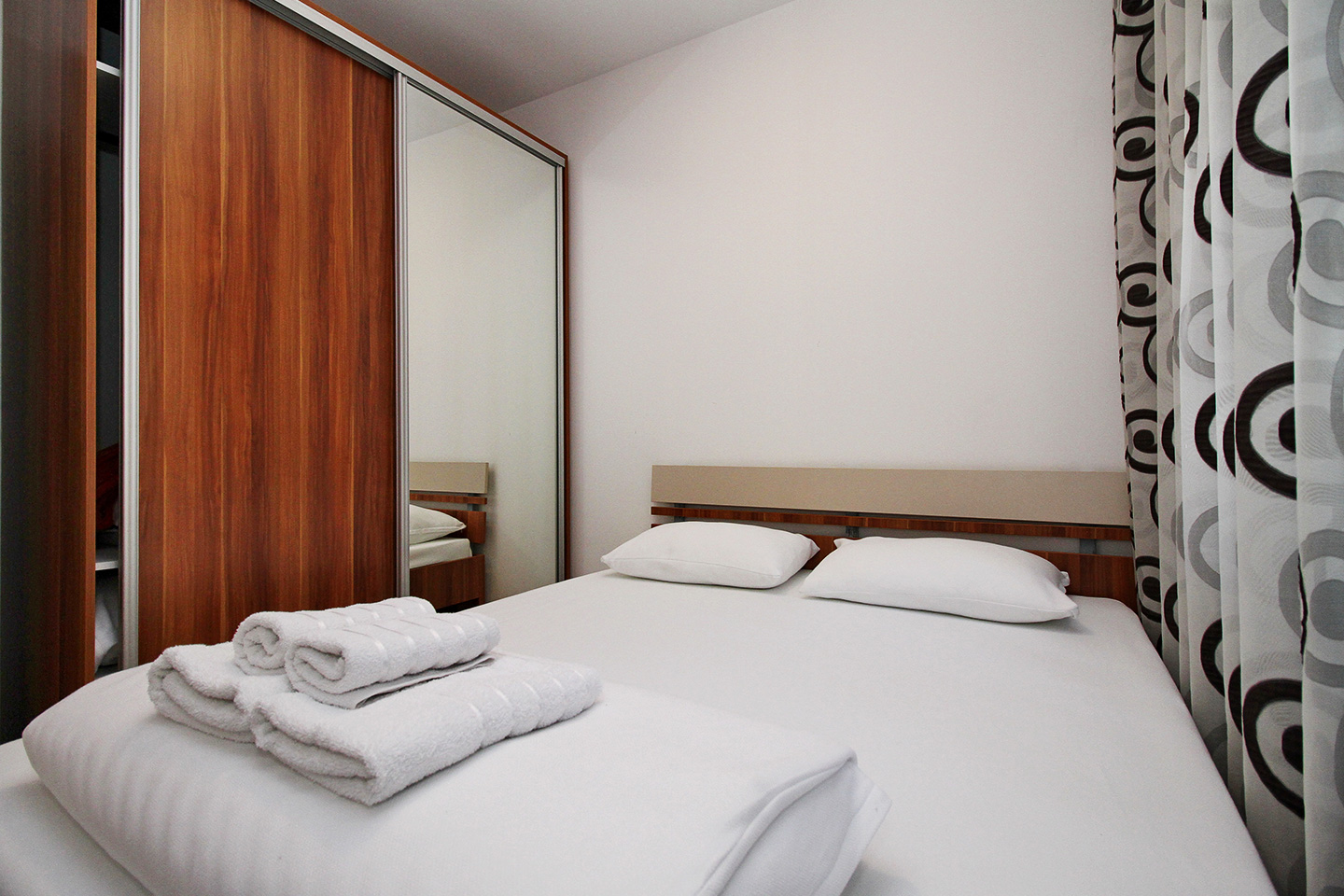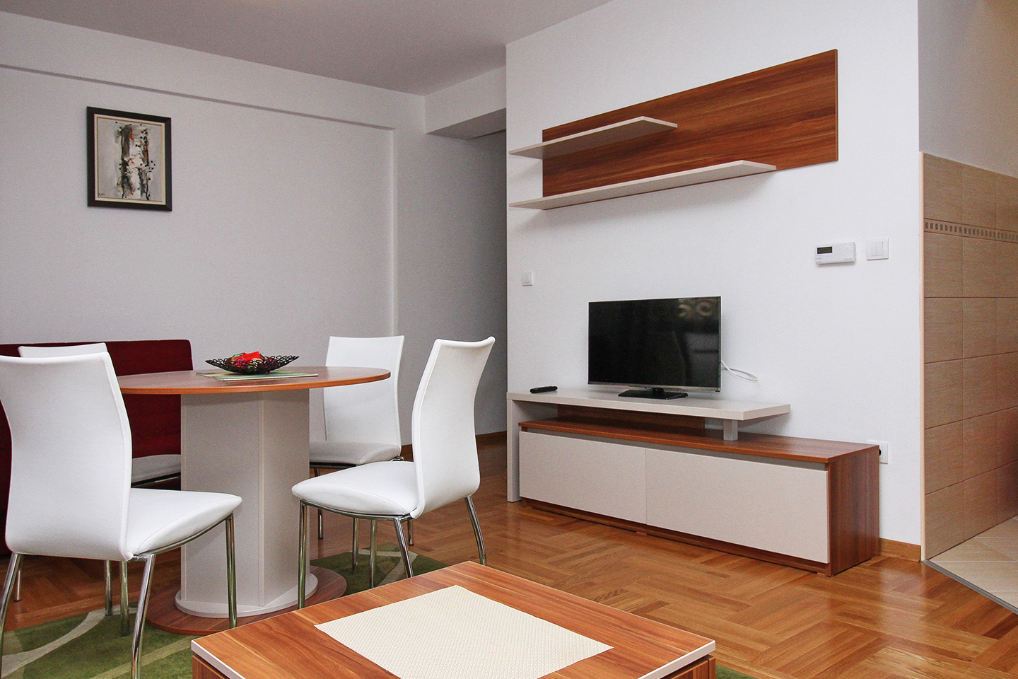 Luksuzno opremljena kuhinja, spavaća soba sa francuskim ležajem, kupatilo i terasa sa pogledom na borove šume, dnevni boravak, kapacitet apartmana 5 osoba.